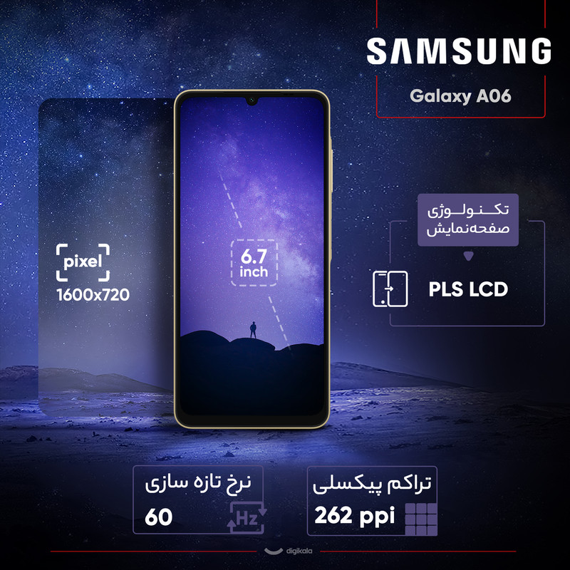 Samsung Galaxy A06 یکی از گوشیهای اقتصادی و جدید سامسونگ است که با طراحی شیک، صفحهنمایش بزرگ و باتری قدرتمند، گزینهای ایدهآل برای کاربران روزمره محسوب میشود. این گوشی دارای نمایشگر 6.7 اینچی PLS LCD با رزولوشن 720x1600 پیکسل است که تجربه بصری مناسبی را ارائه میدهد. در بخش دوربین، از یک حسگر 50 مگاپیکسلی در کنار دوربین ماکرو 2 مگاپیکسلی استفاده شده است که در شرایط نوری مناسب، تصاویر واضح و باکیفیتی ثبت میکند.