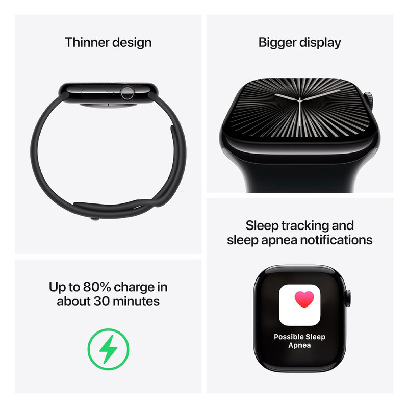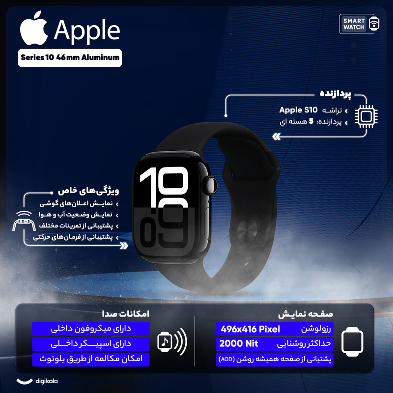 ساعت هوشمند اپل مدل Series 10 با ابعاد 46x39x9.7 میلیمتر و وزن 35.3 گرم، محصولی مناسب برای آقایان و بانوان است که هم در فعالیتهای روزمره و هم در موقعیتهای رسمی و ورزشی قابل استفاده است. جنس بدنه این ساعت از آلومینیوم بوده و در ساخت آن از شیشه Ion-X و سرامیک سافایر بهره گرفته شده است. صفحه نمایش 1.96 اینچی آن از نوع Retina LTPO3 OLED با وضوح 416x496 پیکسل و تراکم 326 پیکسل بر اینچ بوده که قابلیت روشنایی بین 1 تا 2000 نیت را دارد. این ساعت با سیستم عامل WatchOS نسخه 11 و پردازنده Apple S10 عرضه شده و از فناوریهای مکانیابی GPS، A-GPS، GLONASS، GALILEO، BDS و QZSS پشتیبانی میکند.